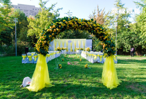 用丝带装修宾客的座椅,将靠近走廊的一排座椅搭起来,然后别离绑上一束束的百合花或许白色玫瑰,就形成了新人经过的走廊。
