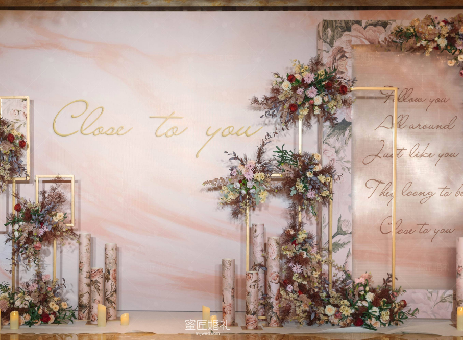 主舞台:温柔裸粉与硬朗玫瑰金相遇,刚柔间尽显雅致;印花暗纹喷绘复古高贵,花艺拱门精致梦幻,框型铁艺立体花亭。