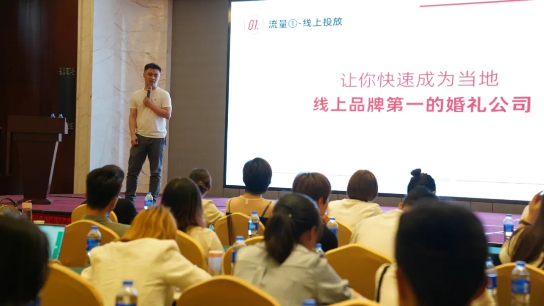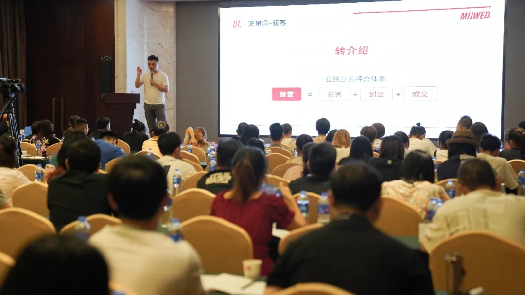 本次培训交流会为期三天,蜜匠婚礼CEO黄红、及蜜匠婚礼总部经营管理、产品研发、高级定制、人力资源管理、品牌管理等各版块负责人为逾200位蜜匠婚礼会员店代表,围绕执行高峰规划、营销活动落地、人才管理、互联网技术产品应用、供应链优化等多个方面进行专题培训,为后疫情时代婚庆企业如何突破和变革凝心聚力,做足准备。可以预见的是,2020年下半年,尤其9、10月份,我国婚庆市场将迎来疫情之后的第一个业务高峰期。各家婚企门店该如何应对?蜜匠婚礼总部相关业务版块负责人就婚企经营管理常见问题、线下营销活动落地技巧、异业合作洽谈要点、执行高峰应对等诸多婚企门店关注的版块进行详细阐述解答,为各地会员店“充电”蓄能,以攻占下半年业务高峰,实现业绩快速增长。会上,蜜匠婚礼CEO黄红就“如何理解业务与管理”专题,从线上流量投放、婚庆工具使用、人才管理等方面进行深度分享。他表示婚庆对于消费者来说是一个决策很重的行业,婚庆门店需要在将品牌、服务和信任三个方面做足功夫,快速向高标准、高水平靠拢、看齐,才能在下半年的市场竞争中立于不败之地。