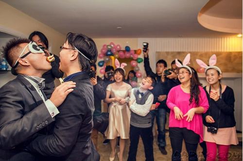 2、面包心语:新郎、伴郎两两配合,自行协商选定某片被伴娘涂满未知酱料的切片面包,然后伴娘将面包片夹到他们两人嘴边,新郎、伴郎只能用嘴巴调整面包位置,咬出新娘名字的英文首字母。面包若有掉地情况,则两男现场拥吻!另外边角料强烈建议新郎、伴郎吃掉,为后面的“游戏”储备能量!