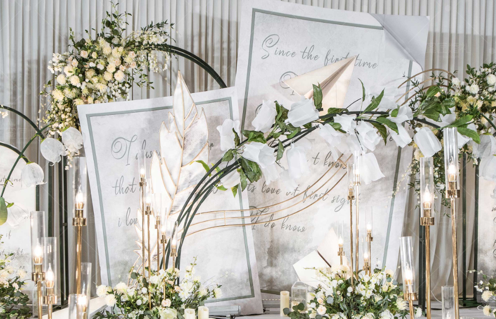 1.迎宾区:迎宾区也就是婚礼入口处,一般有专门的签到台。迎宾区的布置一定要显眼,方便宾客们寻找。还要准备好迎宾海报,也可以制作专门的婚纱照背景墙。