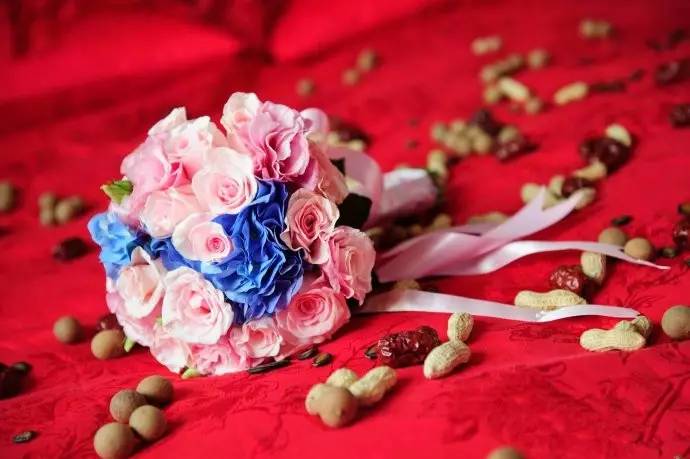 撒帐是指将花生、桂圆、莲子、栗子、枣等干果铺撒在婚床上,取义“早立子、莲生子、花生子(儿女双全)”的生命祈愿。另外还会放上鲜花,一般选择玫瑰或百合,起到装饰作用。
