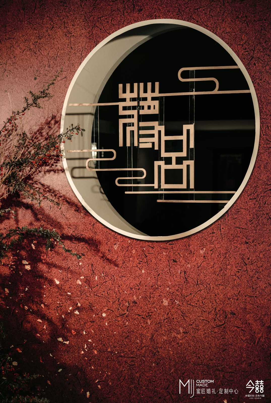 这场婚礼的主题设计,也多以金、红、木色为主,主舞台用的是古代用锦带结成连环回纹的花样,状如两心相连的装饰品。