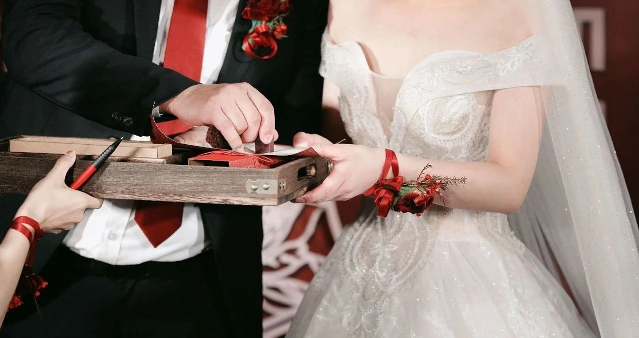 老师手持婚书,念完婚书内容,新人在婚书上盖上自己的印章,这枚印章是老师提前为一对新人定制的。