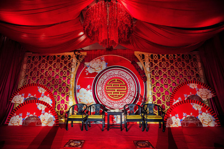 在举行结婚仪式那天,新娘的嫁妆要先送到男家,然后由新娘的弟弟陪着新娘和送亲的人们再到男家去。等新娘新郎进入新房之后,新娘的弟弟便拿出一条门帘挂在新房的门上。门帘多为红色或粉红色,上绣鸳鸯戏水或秀水奇峰,绚丽多姿,甚是喜庆。