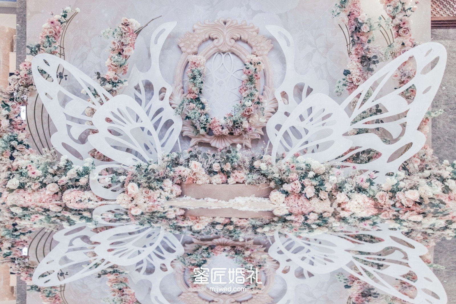 主舞台:蝴蝶翅膀轻盈扇动,闪耀你我的爱情;欧式相框独家定制、精致花艺温馨浪漫、巨型蝶翼空灵梦幻。