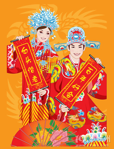 5、佳偶双双已天成,金玉良缘喜结盟。夫妻对拜情意浓,不负青春与苍穹。红梅傲雪添喜庆,更添忠贞一生情。雕梁画栋玉屏风,良辰美景到天明。祝:钟爱一生