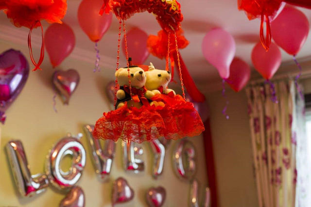 4、使用粉色气球与红色气球一起布置婚房这种能够营造出一种喜庆浪漫气氛,像红色和粉色气球这也是理想选择,而且你可以使用一些小气球绕成的心型装饰婚床背景墙,然后把这些铺满婚房房顶的氢气球,还有零碎点缀婚床的甜心小气球,这样给人看起来也是十分的喜庆与浪漫。