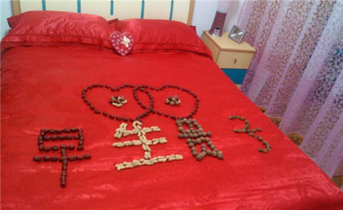 2、铺设摆件床除了要布置成新的,还需要做摆设,放2个桂圆和枣子,为了讨吉利不宜放的太多,这是为了婚后好早生贵子,婚后生活幸福。