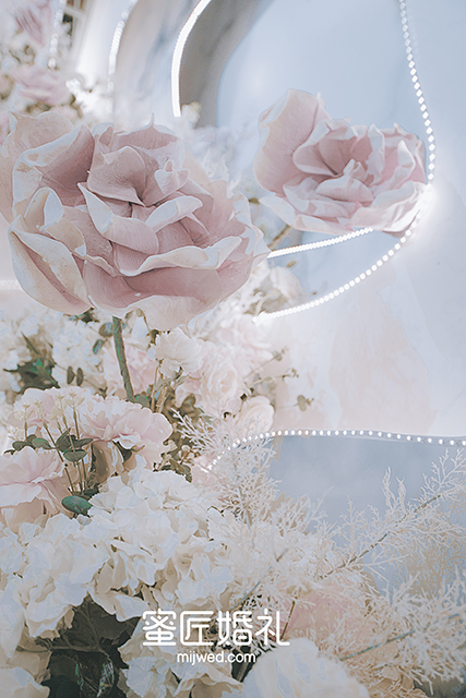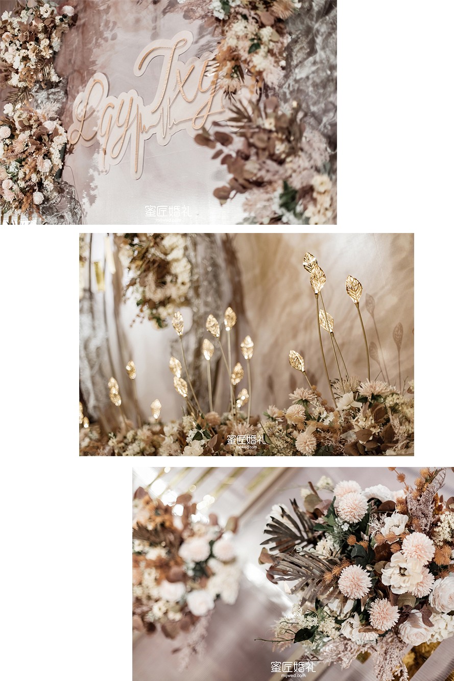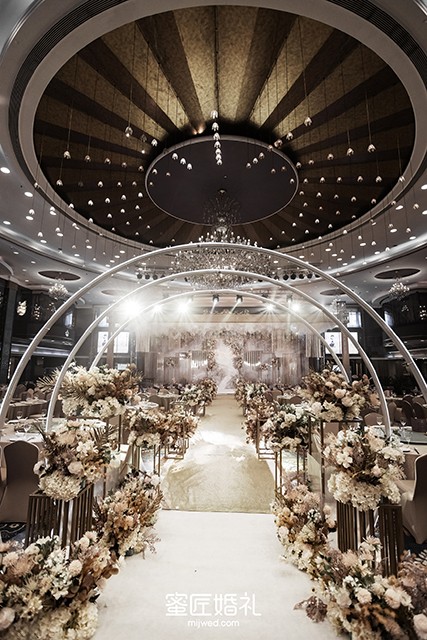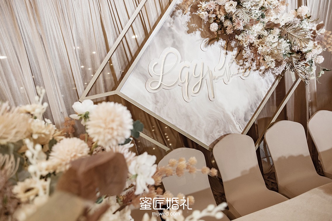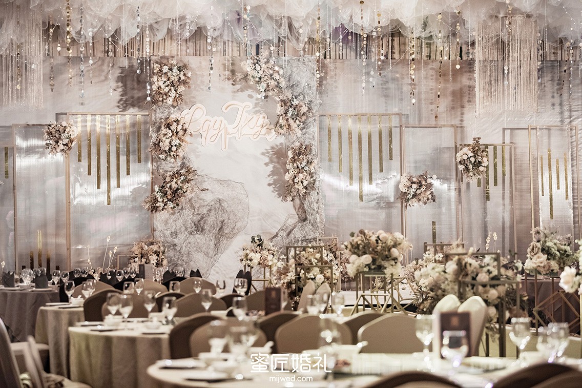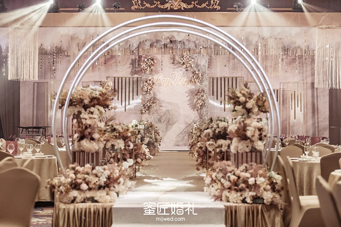 婚礼布置需要柔美的灯光来点缀,还要铺设大面积的香槟色系花材,让整个婚礼看起来温柔高贵。