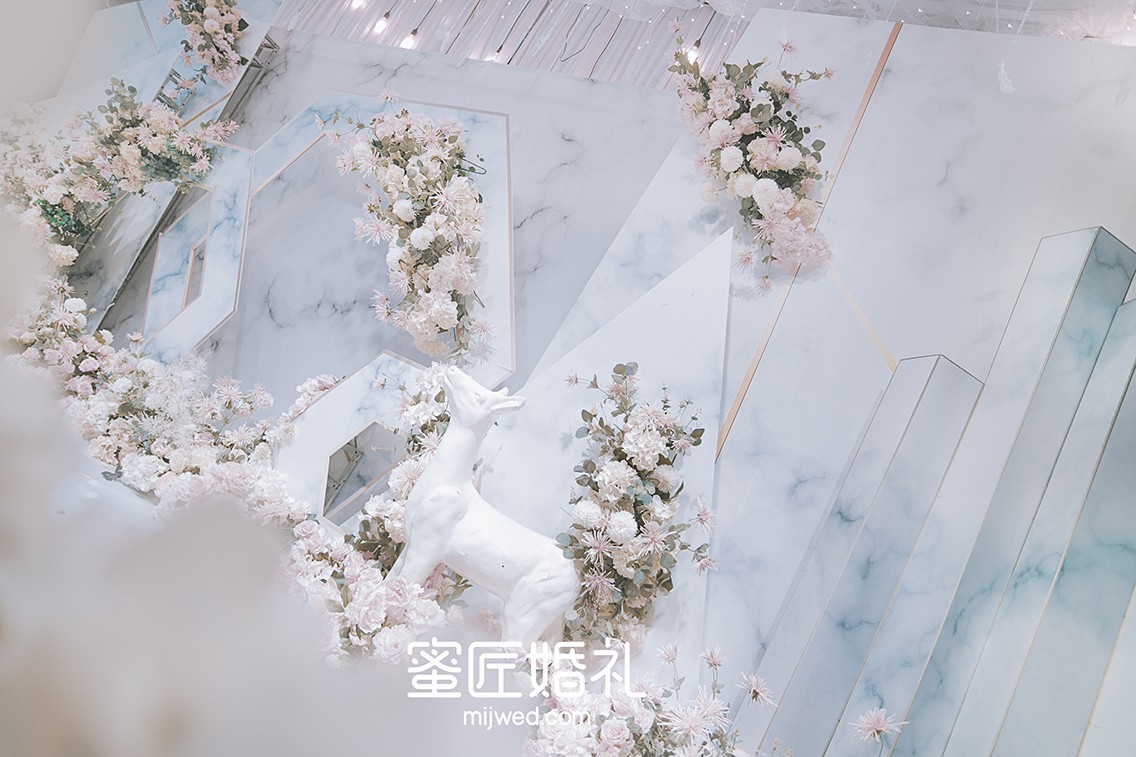 洁白无瑕的空间里,一只纯白的小鹿,轻盈的站在那里,仿佛被新人的美好爱情吸引,成了这场婚礼的见证。