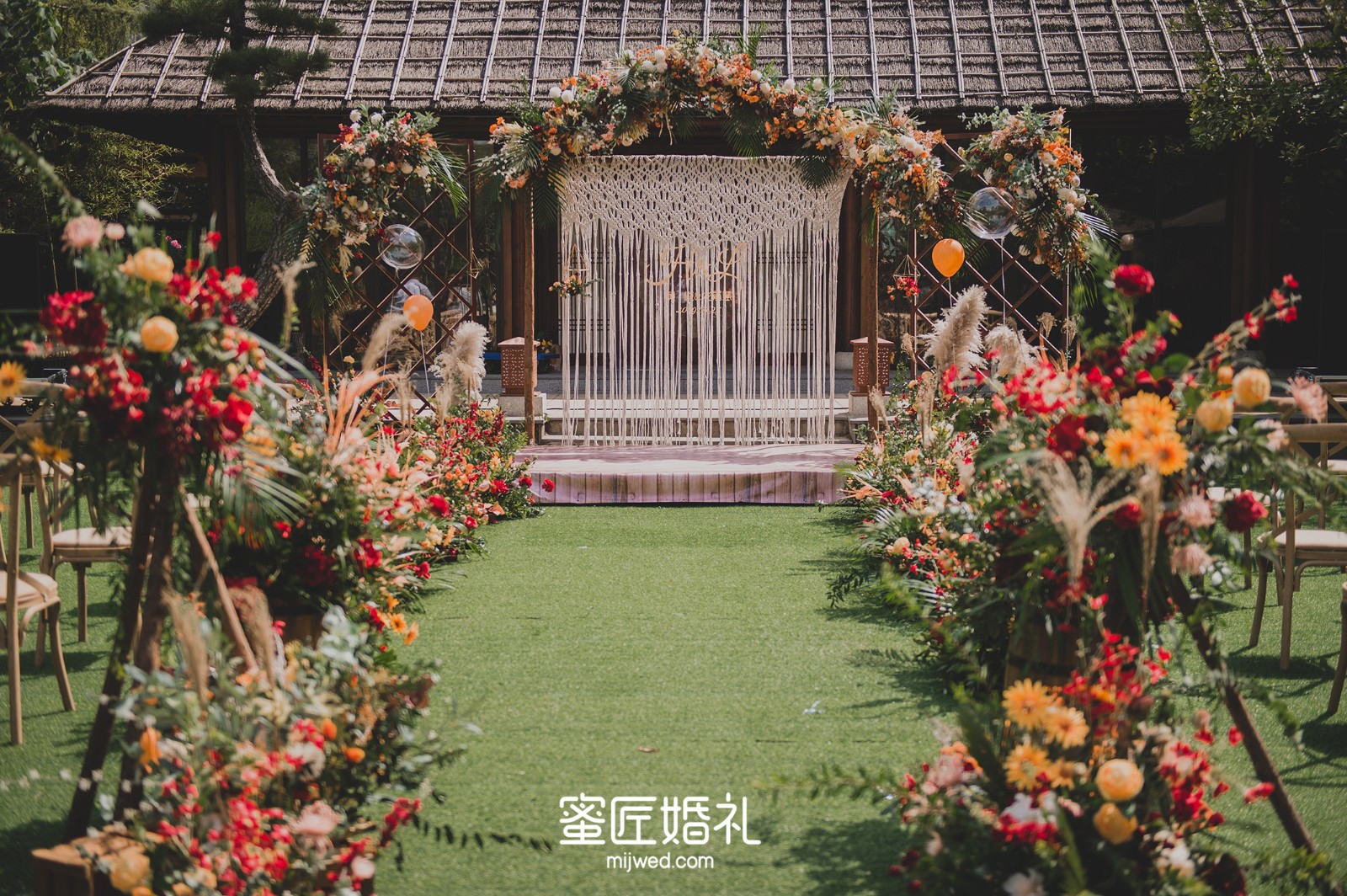 木质的主舞台背景,搭配手工编织的垂帘,为婚礼增加了朴实的质感。