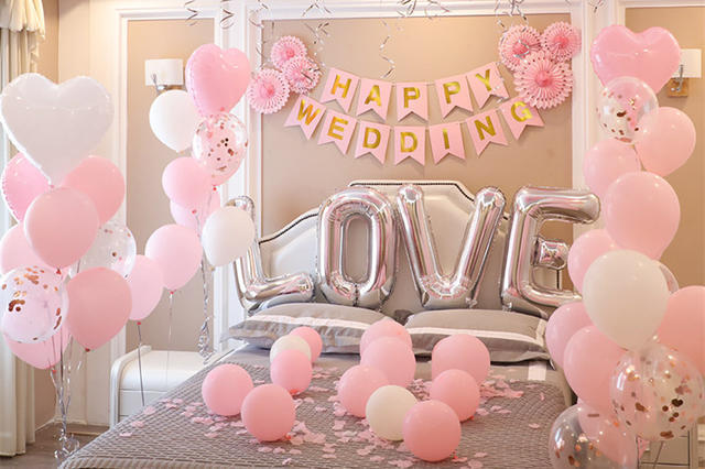 2、气球的颜色不宜过多,尽量不要超过3种。大家可以给气球进行双色搭配,比如说粉色+白色等等,打造出层次感。气球的颜色可以色彩艳丽,不要购买黯淡无光的气球。我们在用气球布置时,要有主次之分,不要随性的乱装饰。除了可以使用气球布置之外,我们还可以使用鲜花、囍字、蜡烛、小彩旗、灯串、照片等作为装饰品,给婚房添加浪漫温馨的氛围。