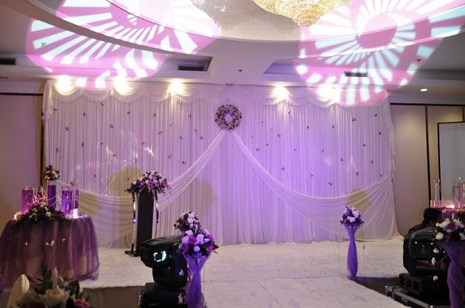 不管是户外草坪婚礼还是酒店婚礼,纱幔的存在会让整个婚礼现场更加唯美梦幻,也更加符合婚礼的主题。如果新人在舞台中央还有LED屏需要摆放的话,纱幔最好布置在两侧以及屋顶。
