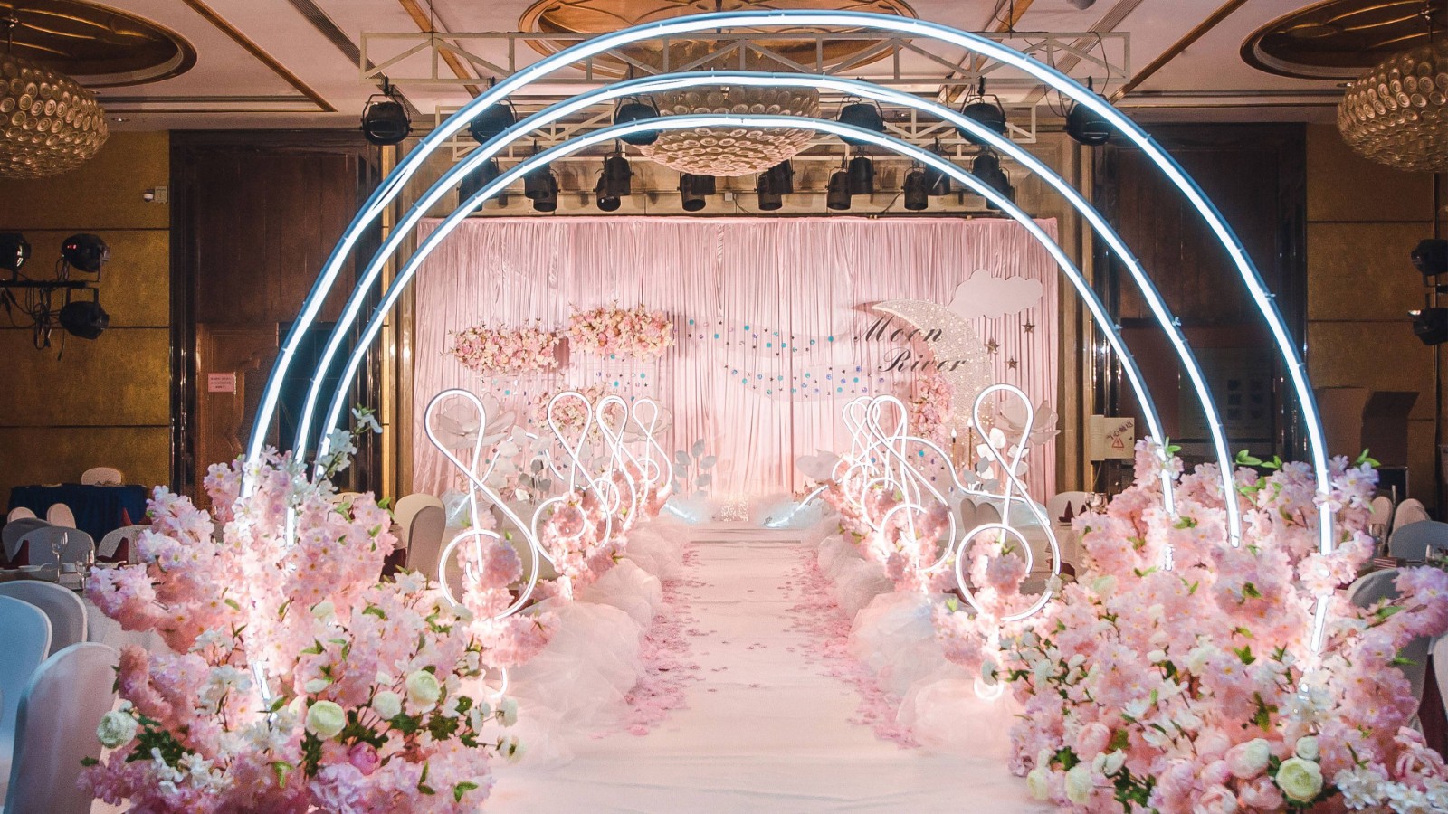 仪式区安置包含门帘,仪式亭,路引,舞台,蛋糕塔和香槟塔,烛台的安置。