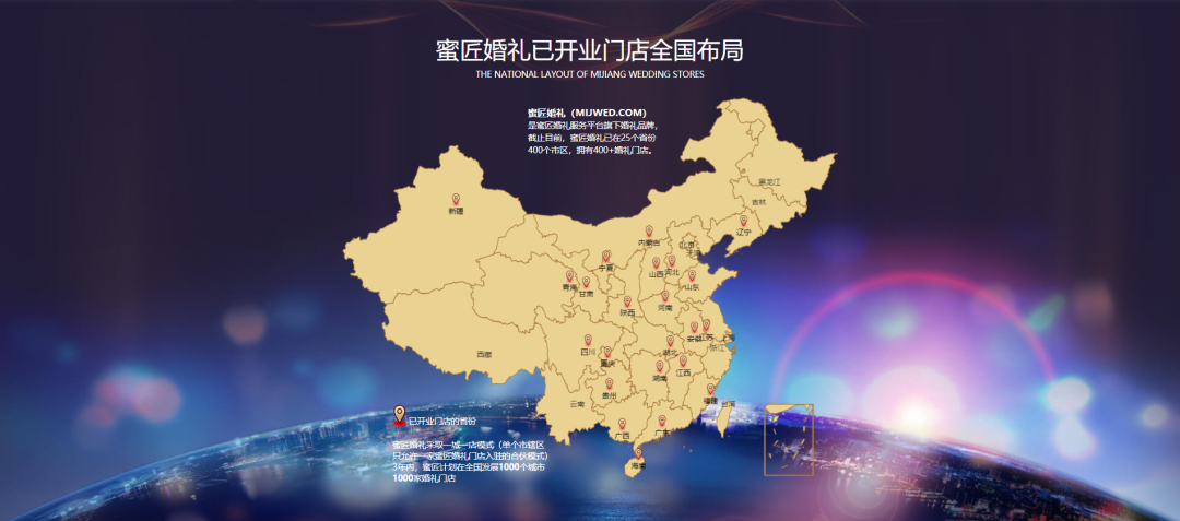 目前,蜜匠婚礼已在6省7城开设14家直营体验店,加盟业覆盖全国25个省份400多座城市,服务了2689358位新人,共举办超过176825场婚礼。