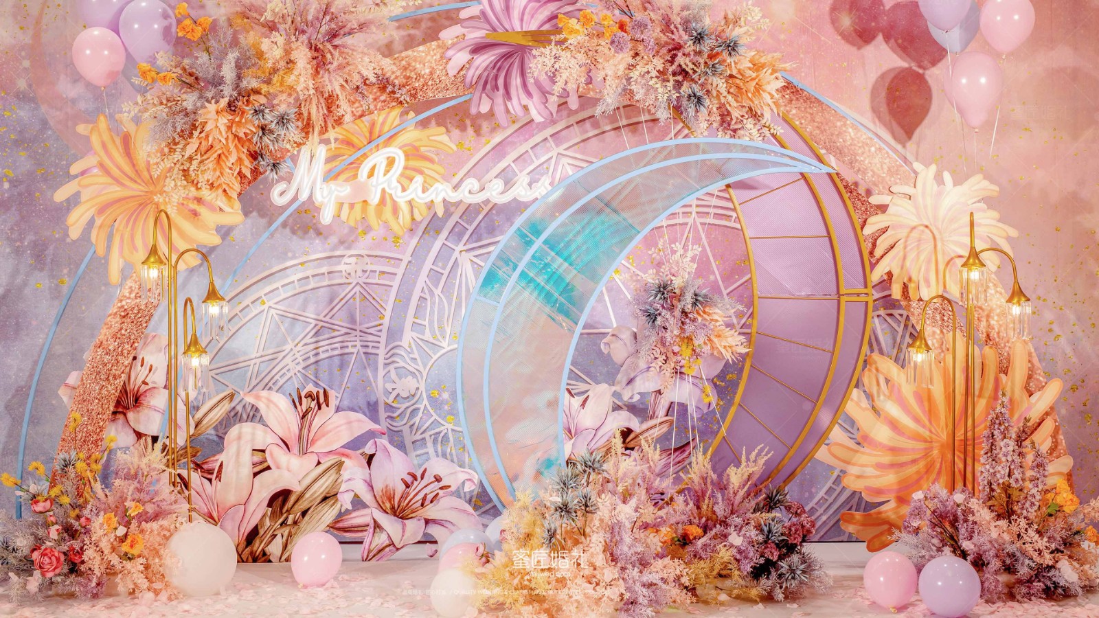 缓缓穿过粉色的海洋,走到王子的身边柔美灯光布景梦幻色彩| 精灵萌宠童话元素| 粉色嵌蓝花海温馨氛围。