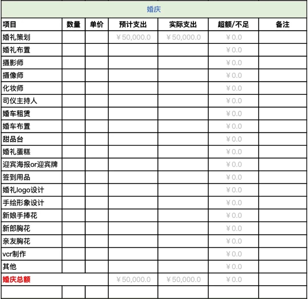 预算分配清晰后,最后一步,我们需要做一张结婚预算表。