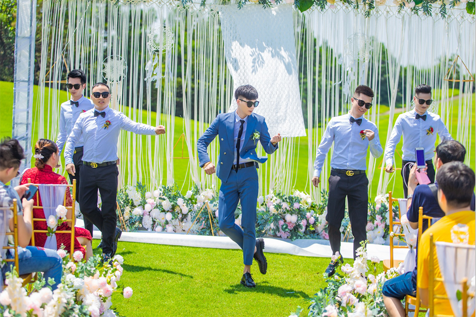 如果新人有才艺,可以尽管秀出来,为婚礼舔光增彩,如果新人没有特别的才艺,让伴郎团或者伴娘团排练一段开场舞蹈秀,也是很能带动气氛的。