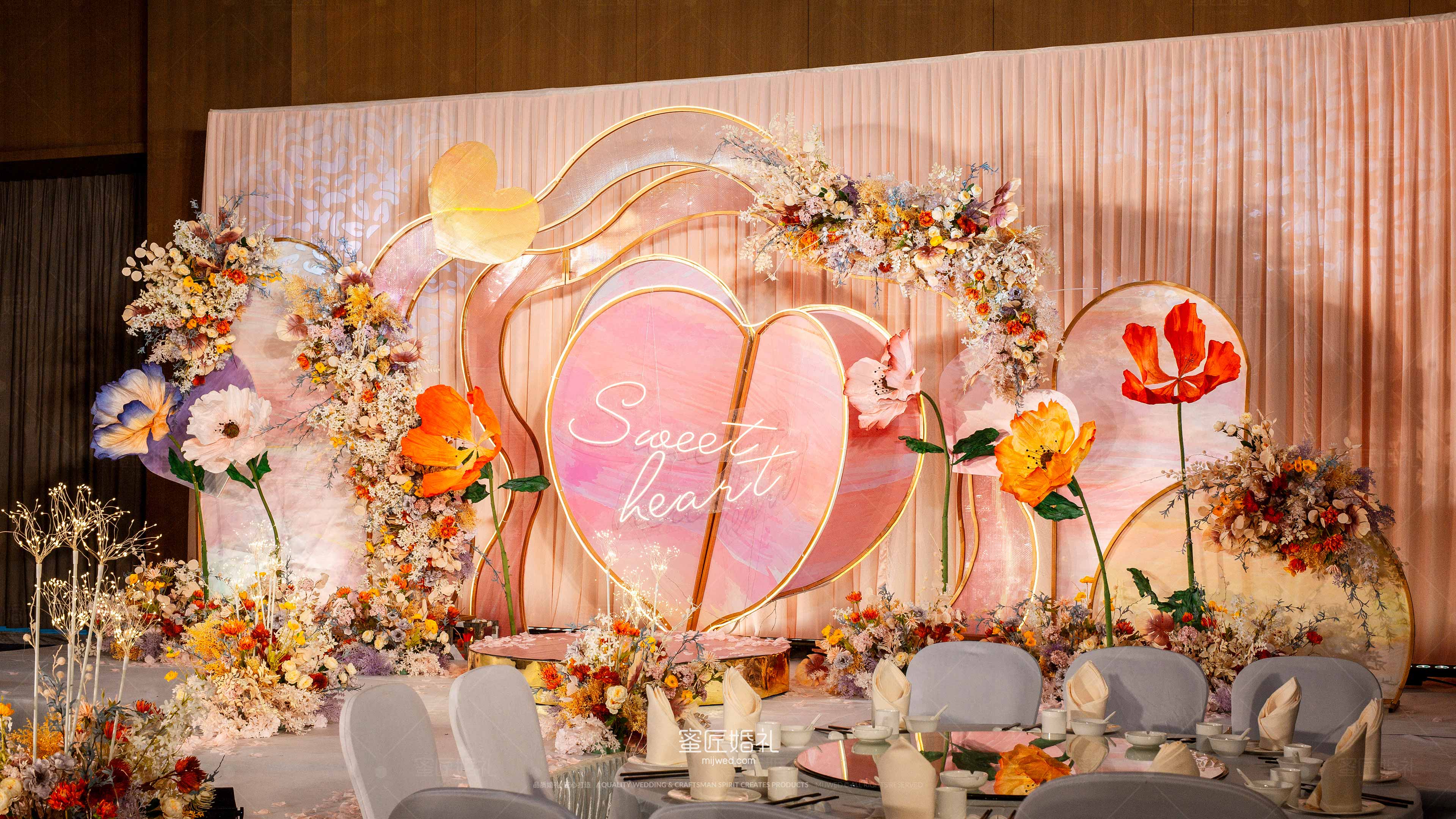 设计灵感源自邂逅月光女神,将灵动的花好月圆造型完美融入到神圣的婚礼中,谱写了一 段古典的爱恋与流行婚尚相结合的恋歌。蜜匠策划师与设计师联袂打造、秉承精益求精的工匠精神,反复讨论、推敲、现场比对测试,较终 以纯净的天空蓝作为主色调,极具感染力的3D景观设计,唯美至极的表面却透露着精致高贵的气质。