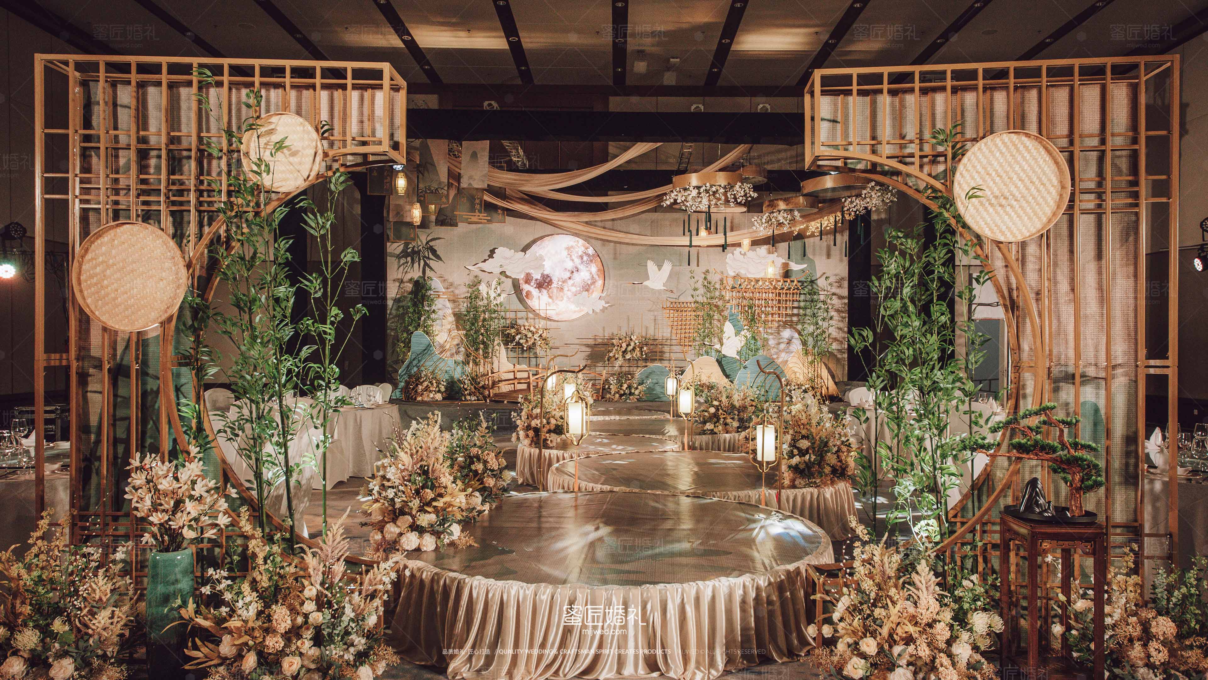 穿越曲径,走向属于爱的地方不规则设计圆舞台不规则摆放| 一步一景地面立体山峦竹林元素| 喷雾造景烟波浩渺意境。