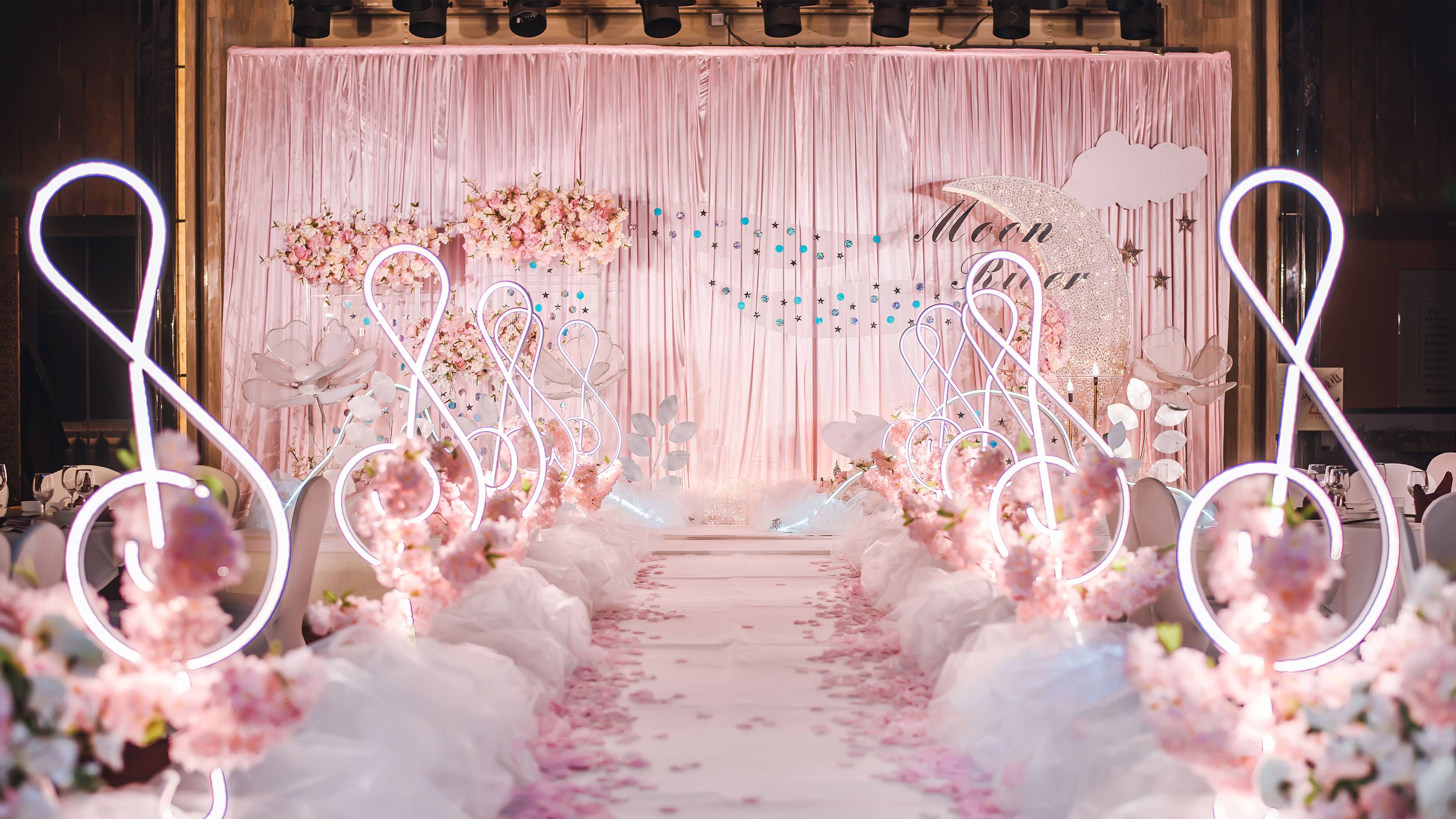静谧蓝与水晶粉的融合,弯月与音符的碰撞,使得整场婚礼唯美而梦幻,发光装饰定制铁艺道具,跳跃的音符带来了灵动活力,皎洁的月光散发出优雅纯净的光芒。