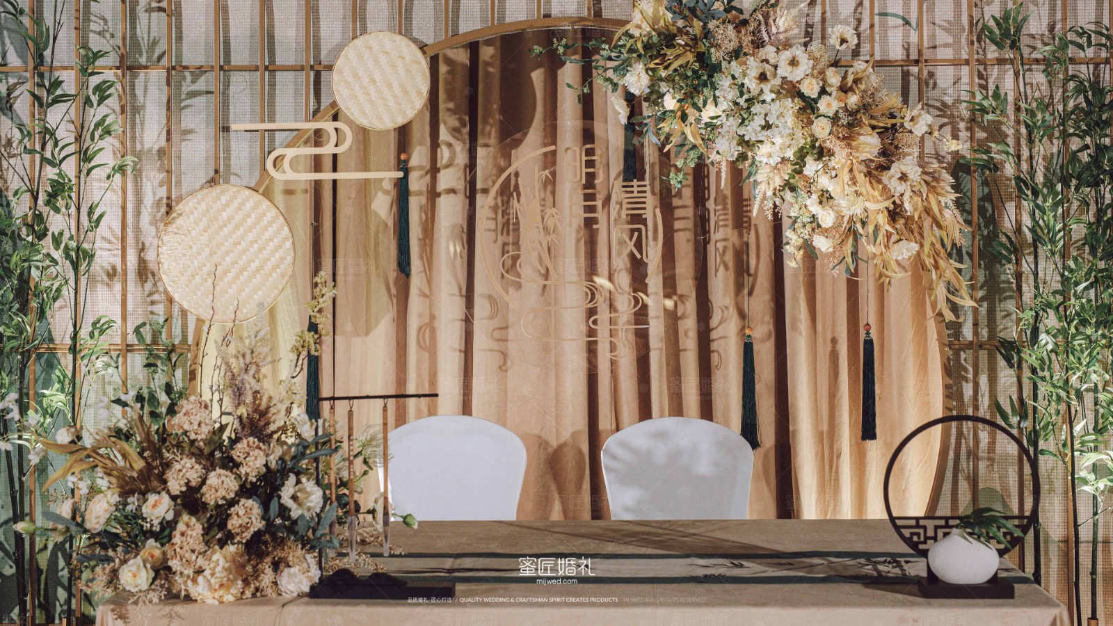 香槟色短绒布打底,墨绿色的流苏垂挂点缀,尽显素雅高级的质感,铁艺天圆地方的造型,台面装饰笔墨纸砚,营造书香气质的中式意境美。