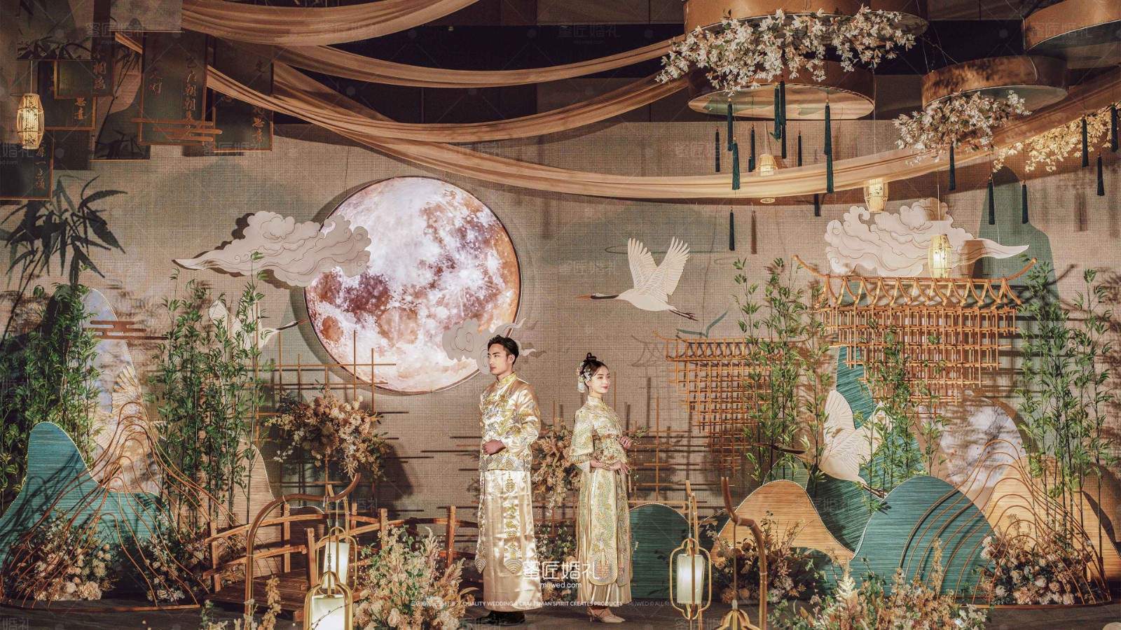 灵感来源于“千里江山图”,整体设计在于表达“寄情于山水”的美感,提炼“千里江山图”中自然山水与人文情调,加以现代化轻奢风格元素,打造一场沉浸式新中式风格主题婚礼。