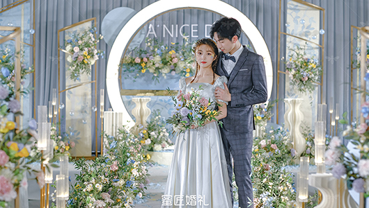 一场夏日小清新蓝色系婚礼,有着明快、纯粹的空间基调。像一杯充满生机的蓝色气泡水,淡淡的水彩晕染,灵动清透,给炎热的夏日带来清澈的生命力。