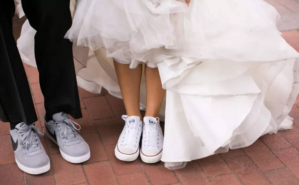 很多准新娘结婚的时候,都会踩上恨天高。如果是本身个子比较高的新娘了,那岂不是让准新郎有点尴尬。不妨考虑一下较时髦婚纱搭配球鞋吧。一双运动情侣鞋青春又信仰很多明星婚礼都能见到了。
