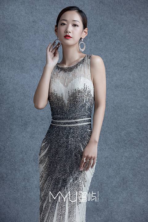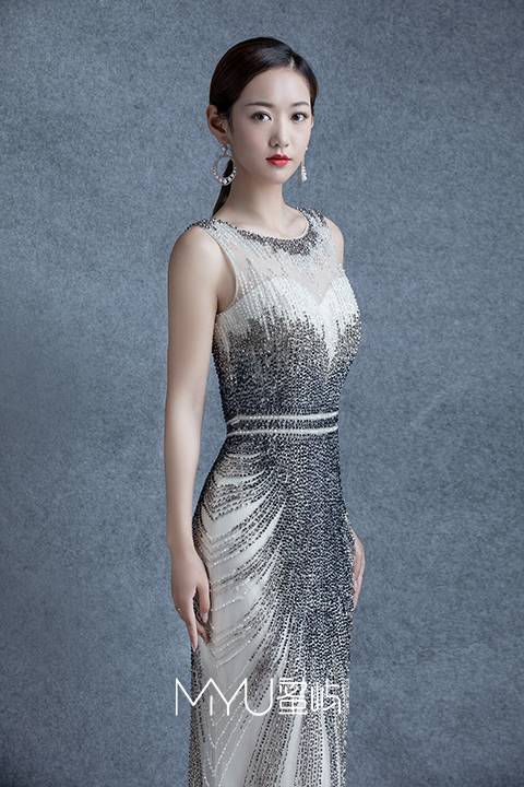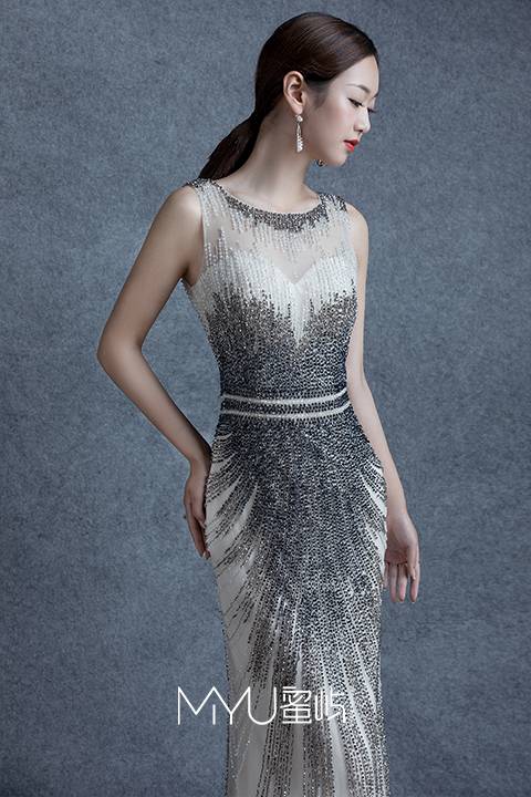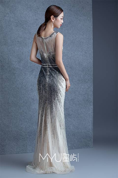 高定重工钉珠修身鱼尾裙,渐变色钉珠图形,勾勒出完美的S型线条,展现出女性性感魅力,华丽而优雅,女王范十足。