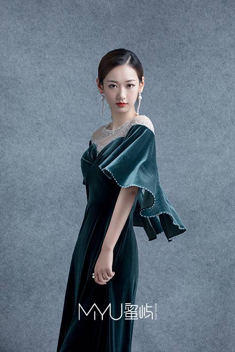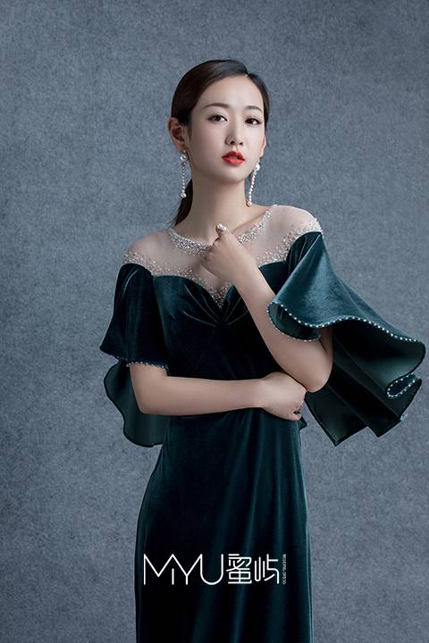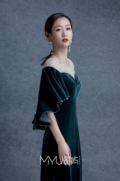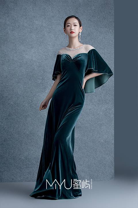 墨绿色丝绒长裙,胸前的手工钉珠和袖边手工钉钻是画龙点睛之笔,优雅的复古气质,低调而不失高贵感。