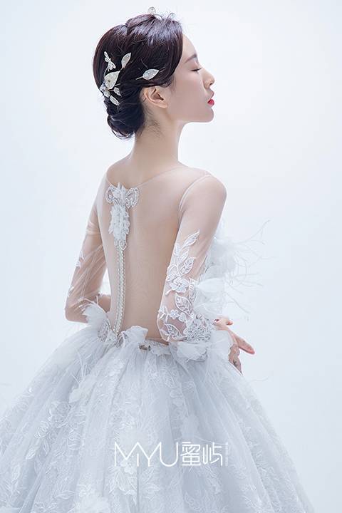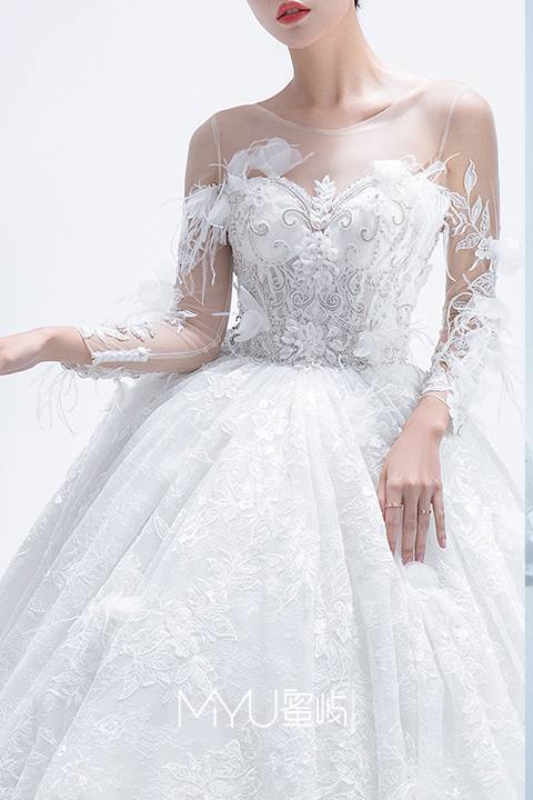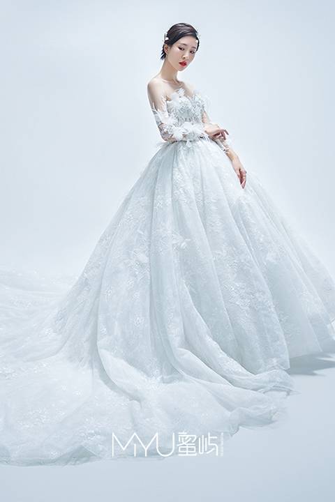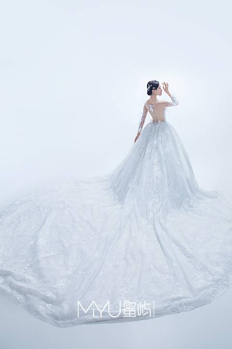 轻纱刺绣大拖尾再现精致浪漫半透明白纱露背与立体造花设计充满艺术感