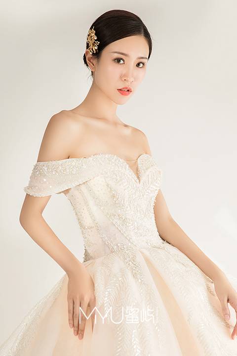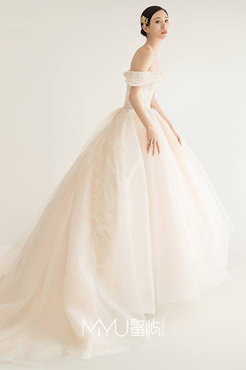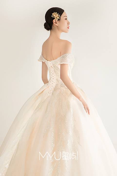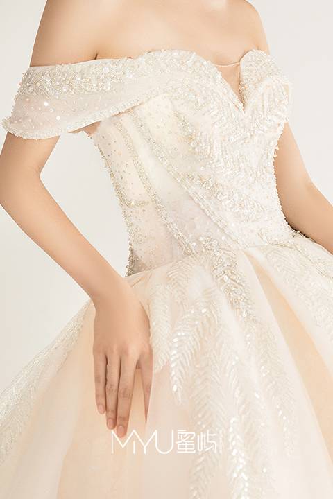 经典一字肩小V领修饰出优雅的颈部曲线,精美钉珠腰身配上法式刺绣长拖尾,细节之处尽显典雅和精致,后背复古绑带式设计,更添时尚感