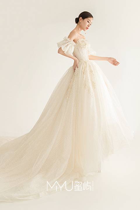 一字肩蕾丝刺绣大拖尾仪式纱