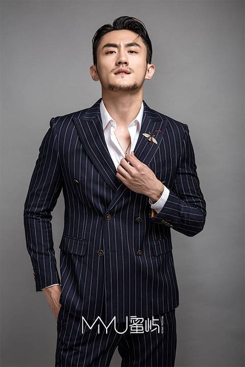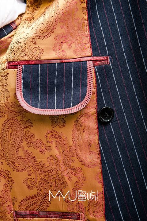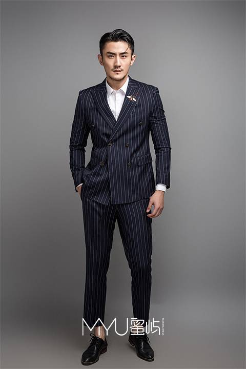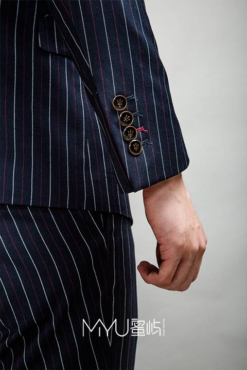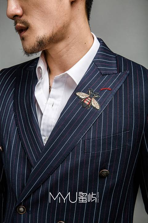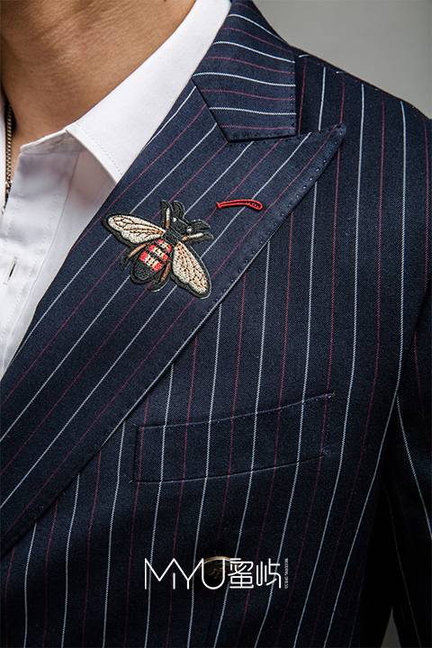 西服:戗驳领+双排六粒扣+袖口四粒扣+领上小蜜蜂刺绣西裤:小直筒
