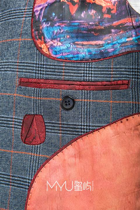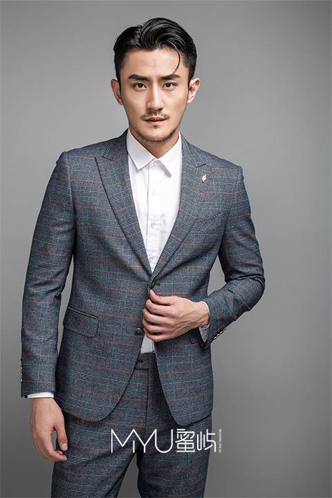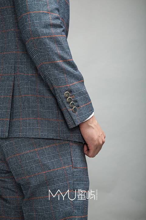 西服:戗驳领+单排二粒扣+袖口四粒扣+袖口第二扣眼跳色西裤:小直筒