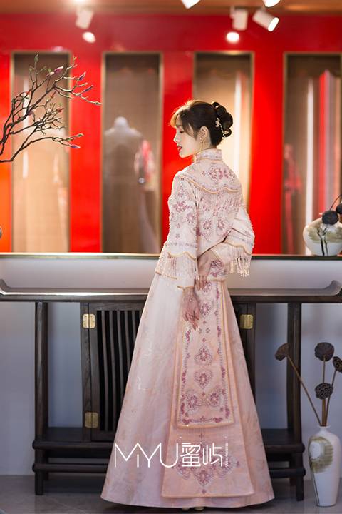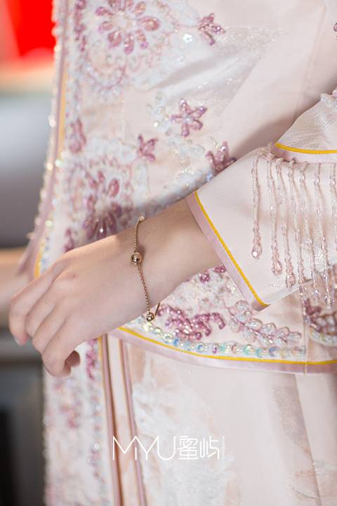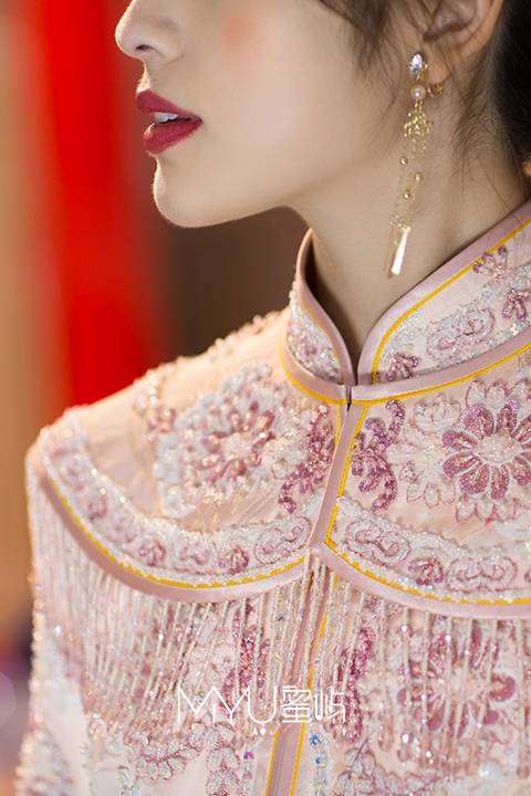 中式立领设计贴合颈部线条,3D立体剪裁修饰精致廓形,双层袖口设计尽显端庄大气; 粉黛色精密烫钻打造色彩层次感。