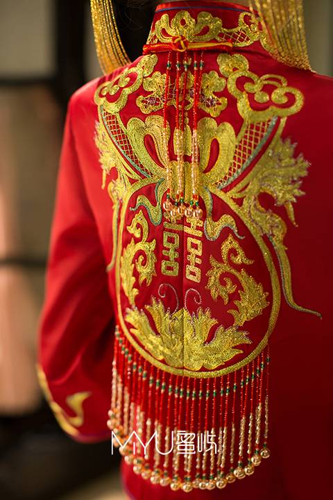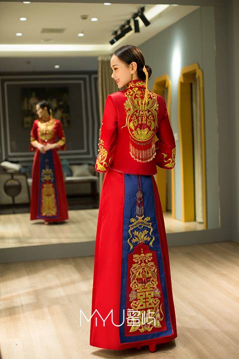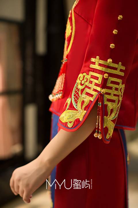 以金珠装饰展现精致,用双喜刺绣传递多福立领盘扣配上v型对襟设计、袖口开衩加上撞色裙褂每一处独特设计都恰当好处让传承与时尚相融