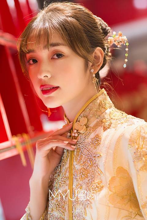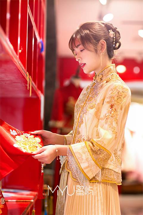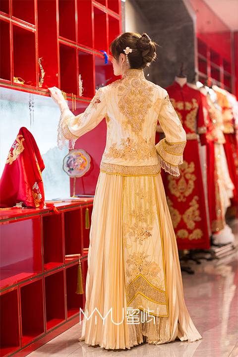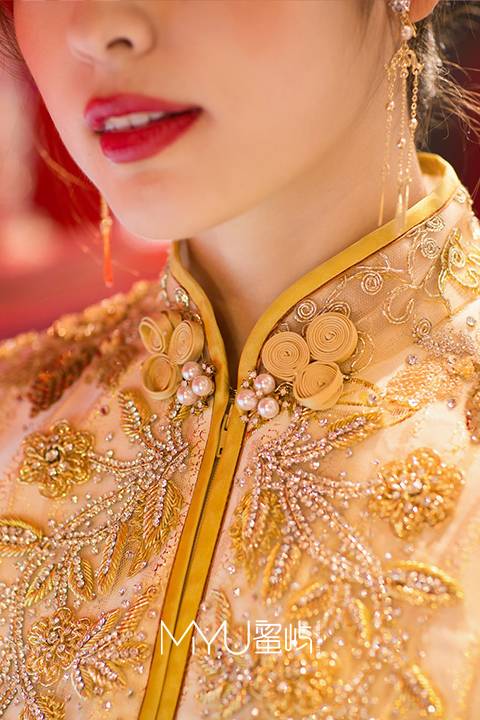 中式手工盘扣领口,以香槟金为主色调
