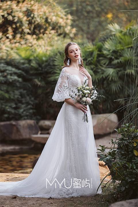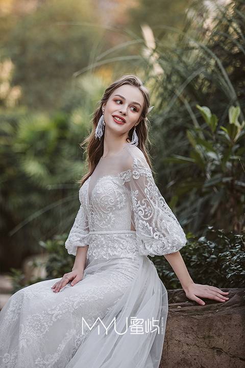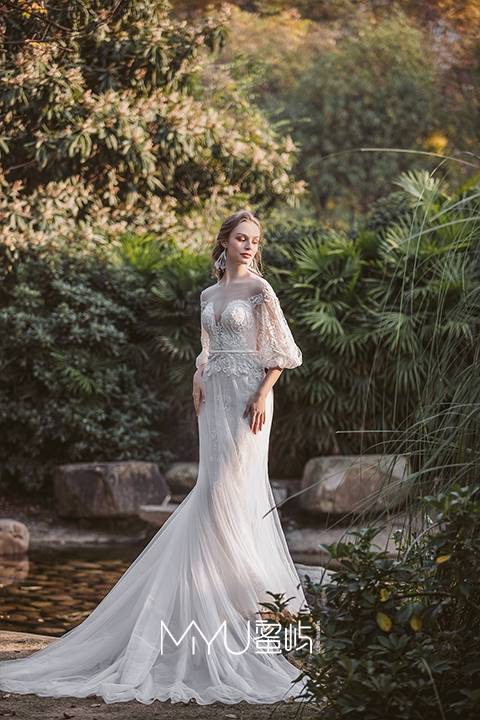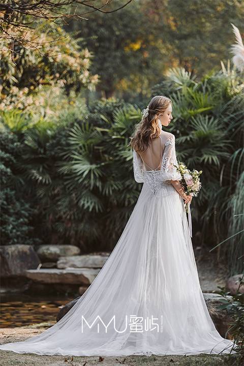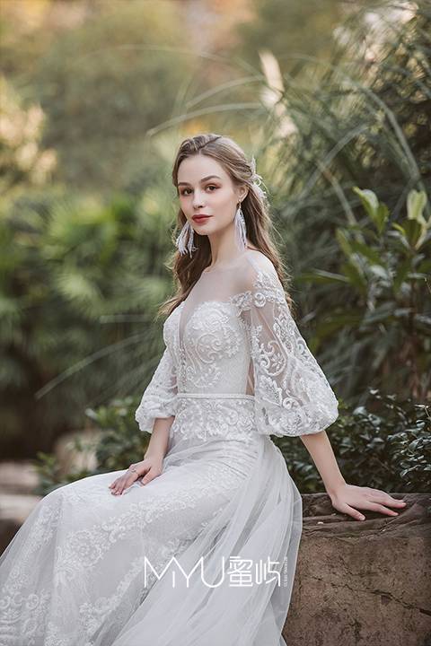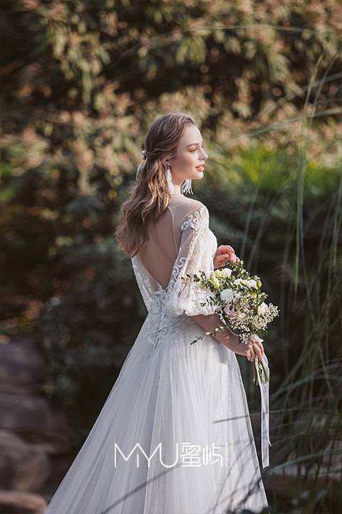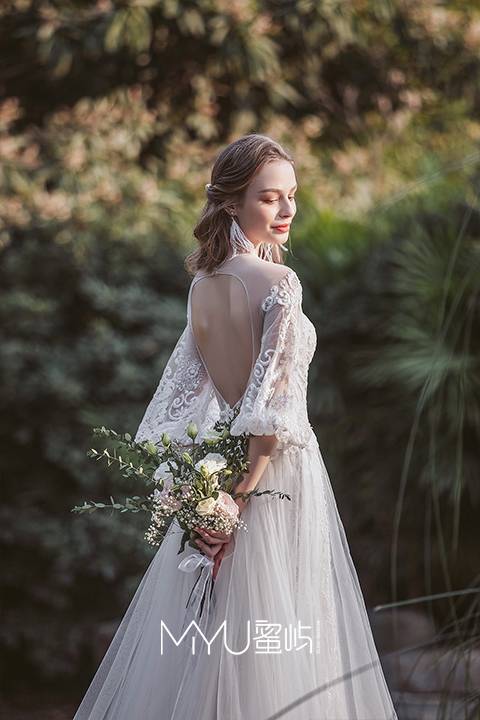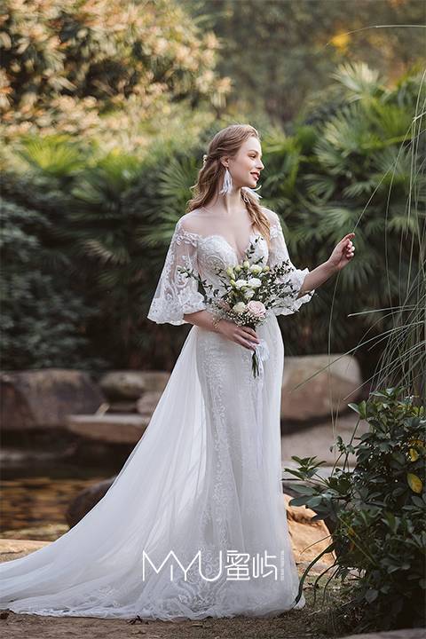 这款婚纱森系中带点文艺的复古,巧妙的鱼尾拖地版型彰显双腿完美的线条,精致的高腰设计,凸显纤细腰身,勾勒出凹凸有致的曼妙身姿,犹如在明媚的春日中,从古堡中走出,漫步后花园的精灵王妃,优雅迷人。