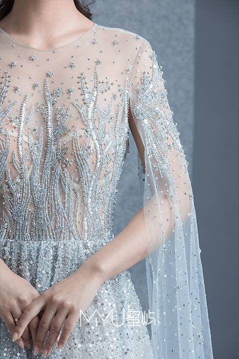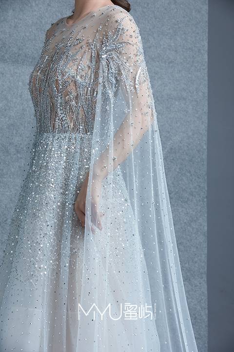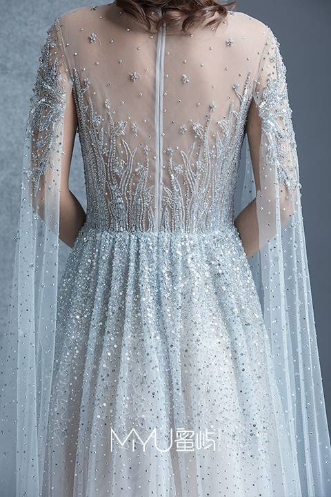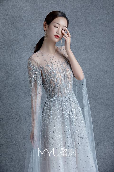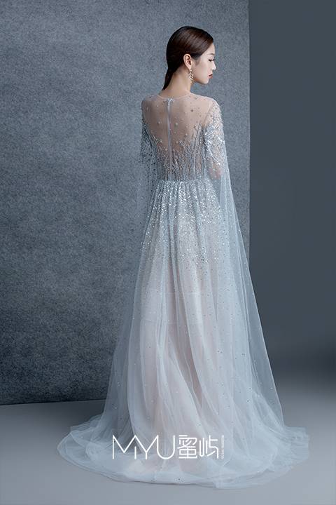 星星般细腻的珠光包裹着裙身,像闪亮的星光洒在纱上,让整件礼服犹如冰雪奇缘般的梦幻,晶莹剔透的渐变蓝凸显白嫩肤色,飘袖设计仙气氤氲,仙女气质如梦如幻。