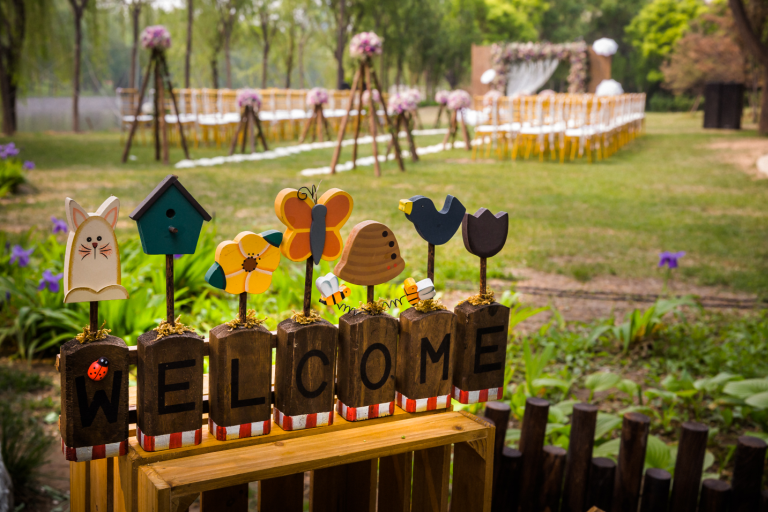 大门时白色的,用花朵和树叶简单的装饰了大门,充满爱的路标,彷如进入了世外桃源。
