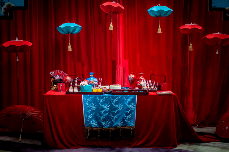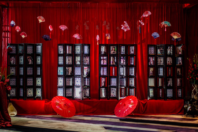 富有中国风的婚礼一定要高大上才有味道!青花、红花、陶瓷杯、刺绣、扇子、花生、红枣作为展示区的装饰,有喜气、吉祥的寓意。