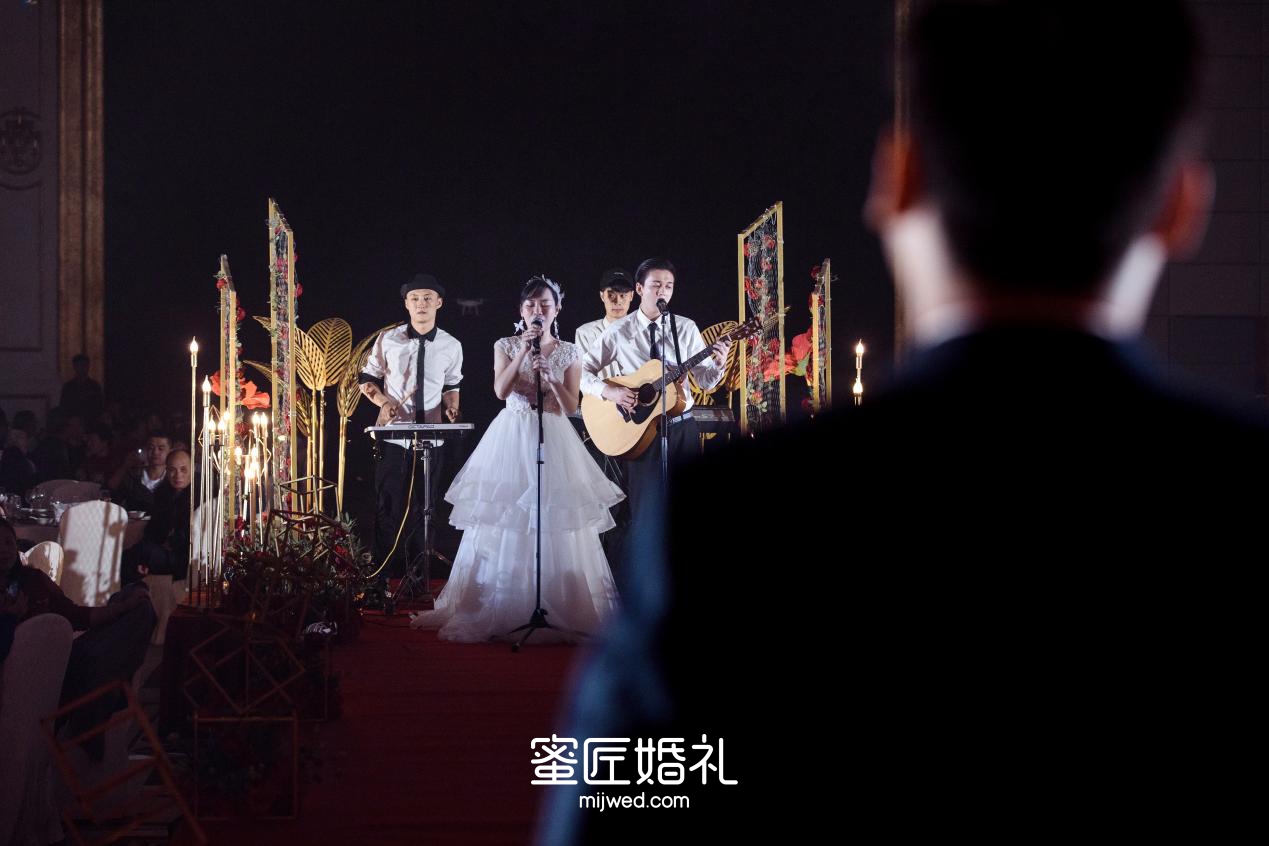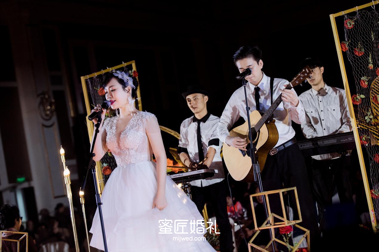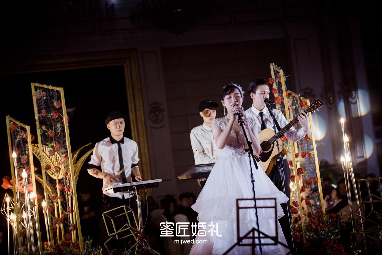 婚礼当天我悄悄安排了一个乐队,开场主持人介绍新娘给新郎带来了一个惊喜时,我就出场了,给我的先生唱了一首歌—《就是爱你》。在场的宾客都很感动,我先生也感动到落泪,这些以后回想起来都是很美好的回忆。
