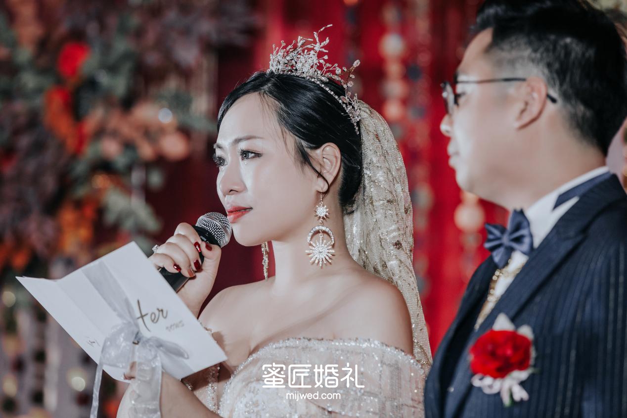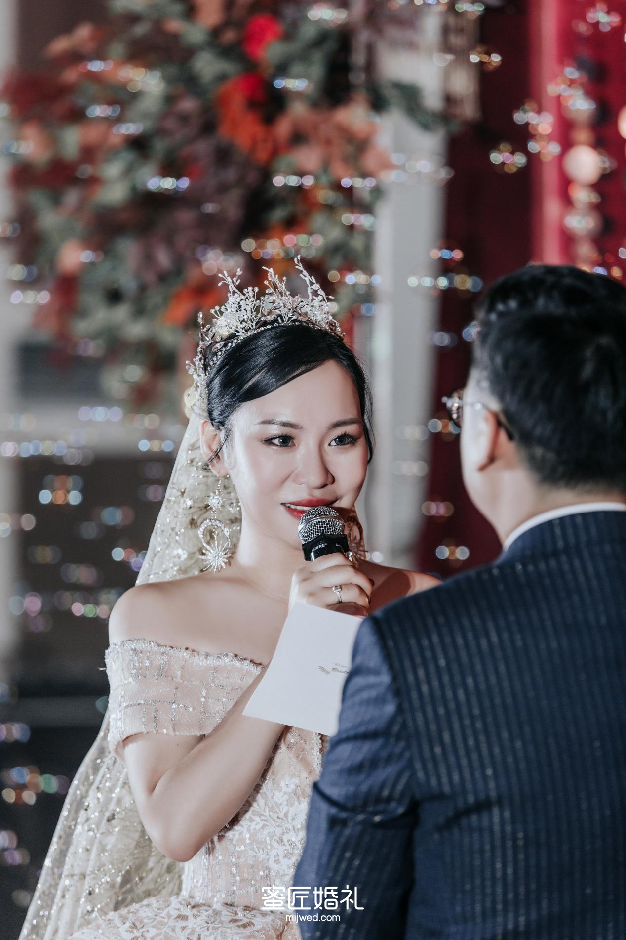 婚礼当天真的很忙,忙到我们都没时间好好说话,一直到台上我们交换婚礼誓词。我们事先都不知道对方要说什么,所以现场听到另一半的真情告白真的很感动,一把鼻涕一把泪的,一定要备好纸巾。千万不要吝啬自己的感情,一定要好好倾诉,一生中就只有这么一次,想让全世界都知晓对彼此的爱意!