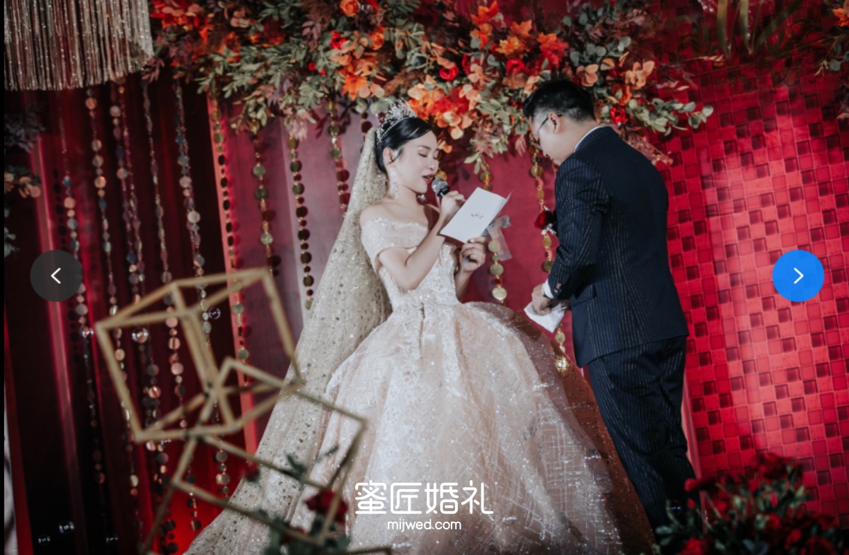 因为我自己就是婚礼人,对婚礼的流程和细节都很熟悉,一开始就有了自己的预算,所以会比较有针对性地去构思整场婚礼。而我跟蜜匠又是长期的合作伙伴,是婚庆公司跟婚纱礼服馆的合作关系,虽然我有很多合作伙伴,也认识很多婚礼策划师,但是我觉得蜜匠的策划师嘉嘉特别热情、有想法,整场婚礼的基调、主题色和平面设计从一开始我就和嘉嘉达成共识,她还给了我很多专业的建议,不需要费劲沟通,这就是懂你的人,所以较后我选择了蜜匠。