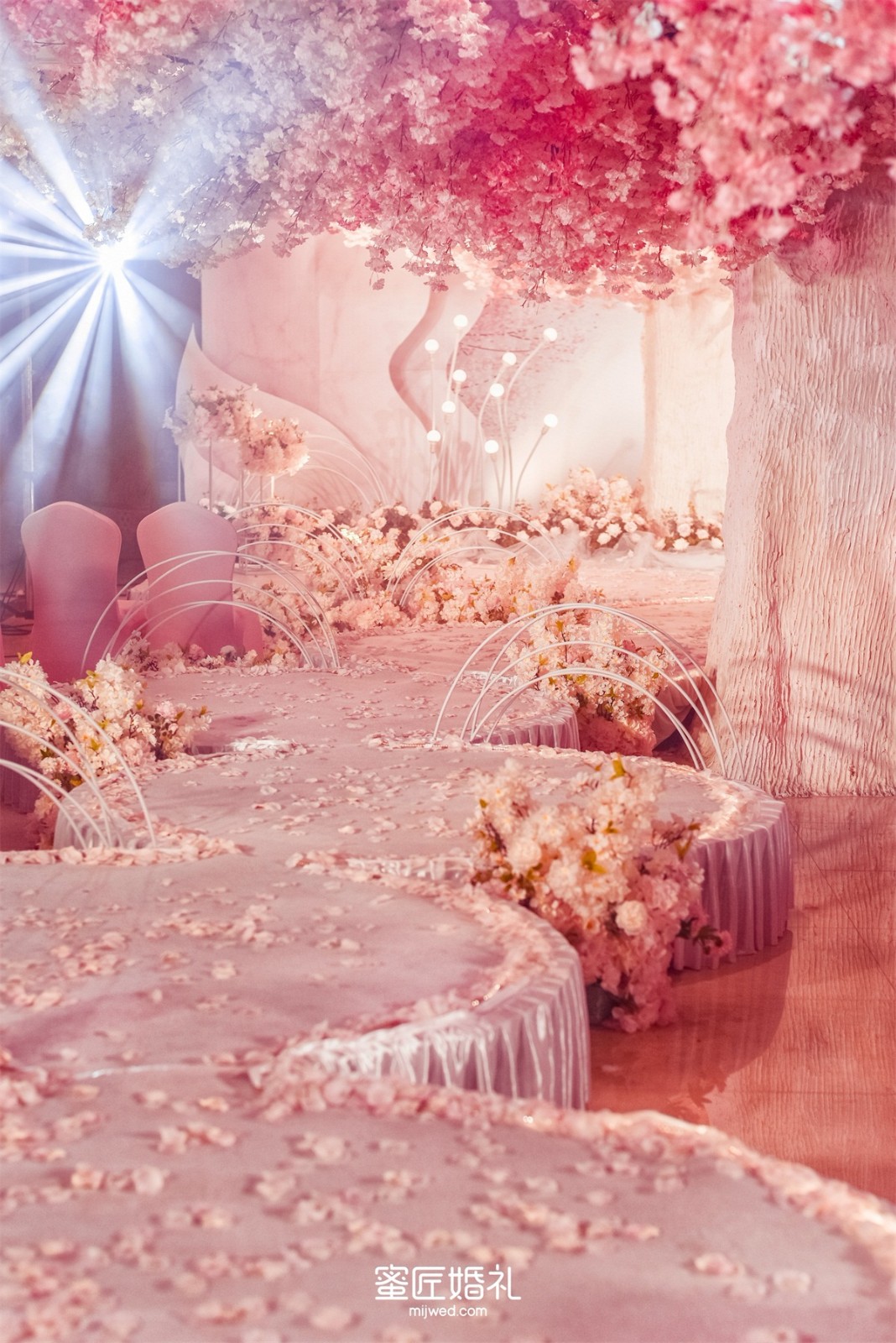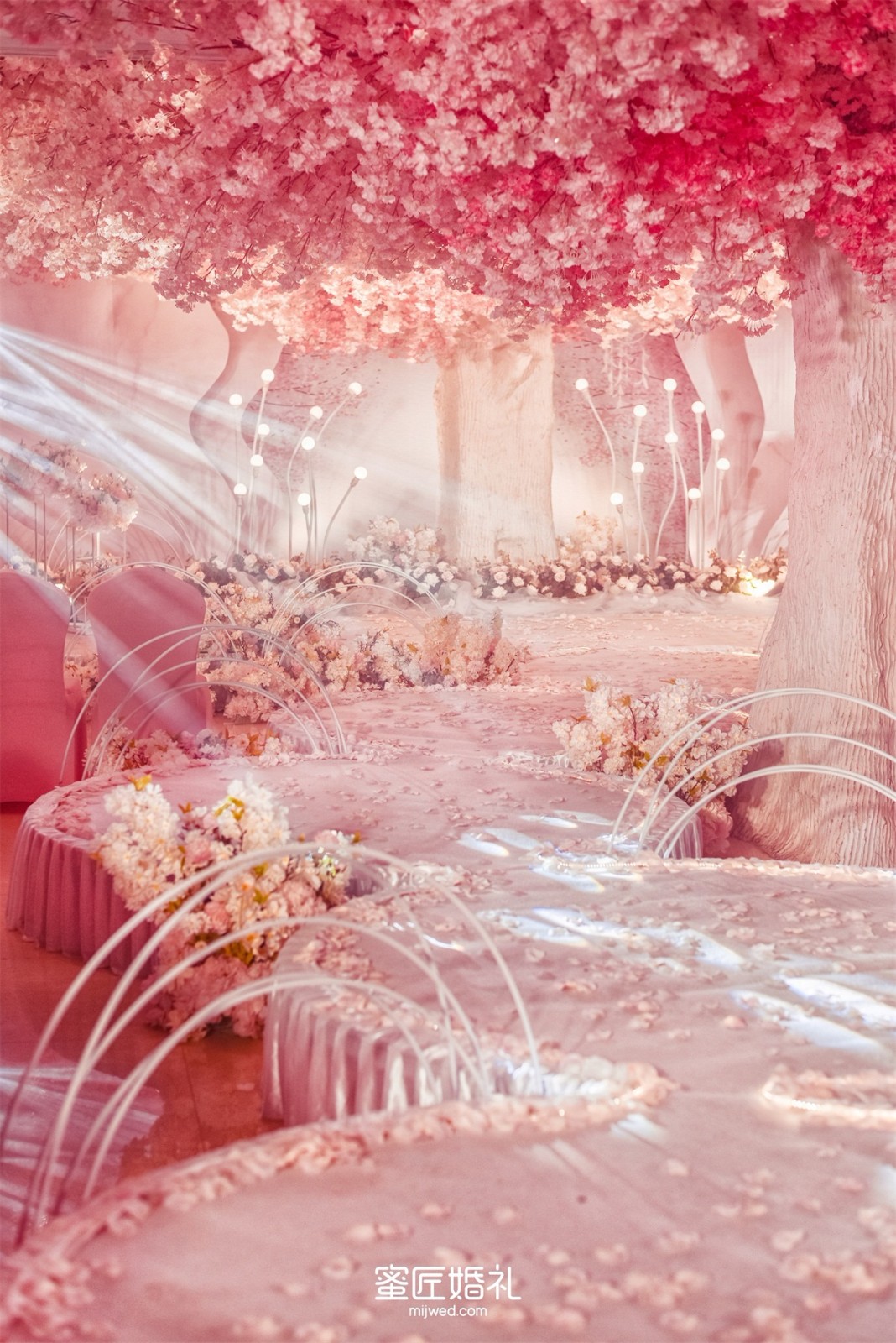现场场地虽不大,但每个地方每处细节都设计得接近完美,樱花粉高颜值婚礼现场,让我有种初恋的感觉,唤醒了我沉睡已久的少女心。微风拂过,花影摇曳,落英缤纷,铺满一地粉嫩,宛如置身梦幻之境,一秒坠入童话的平行世界。