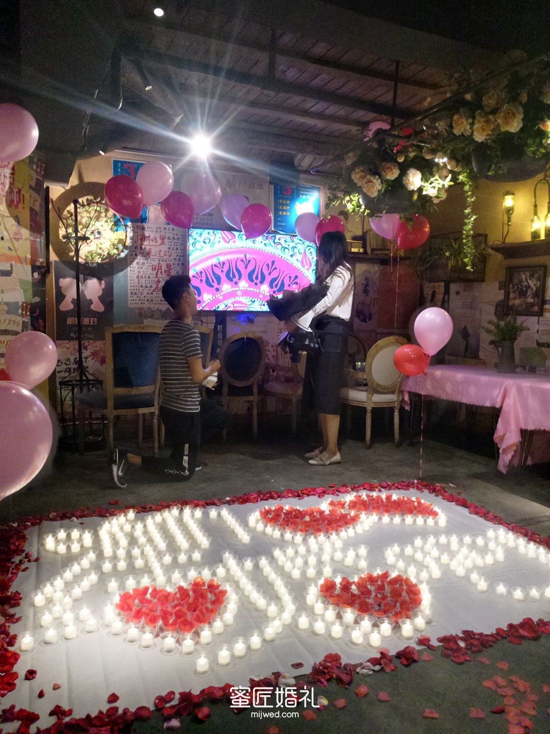后来进门后,我就觉得太不对劲了,一堆人站在二楼,然后就看到我老公抱着花在等我,当时就懵了,完全没想到会是给我求婚。但有一点我现在都耿耿于怀,就是这个直男求婚竟然也不穿的正式一点!