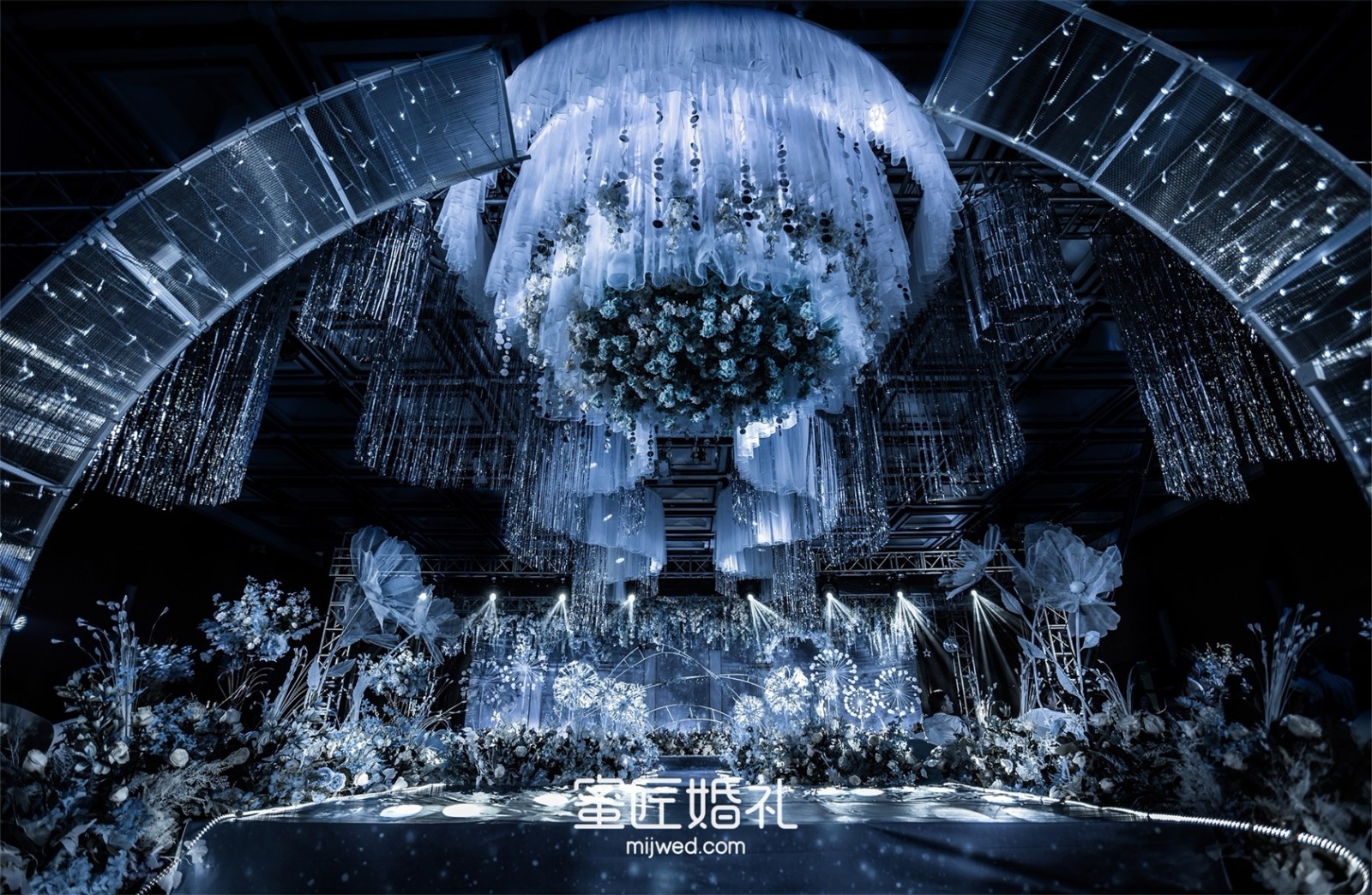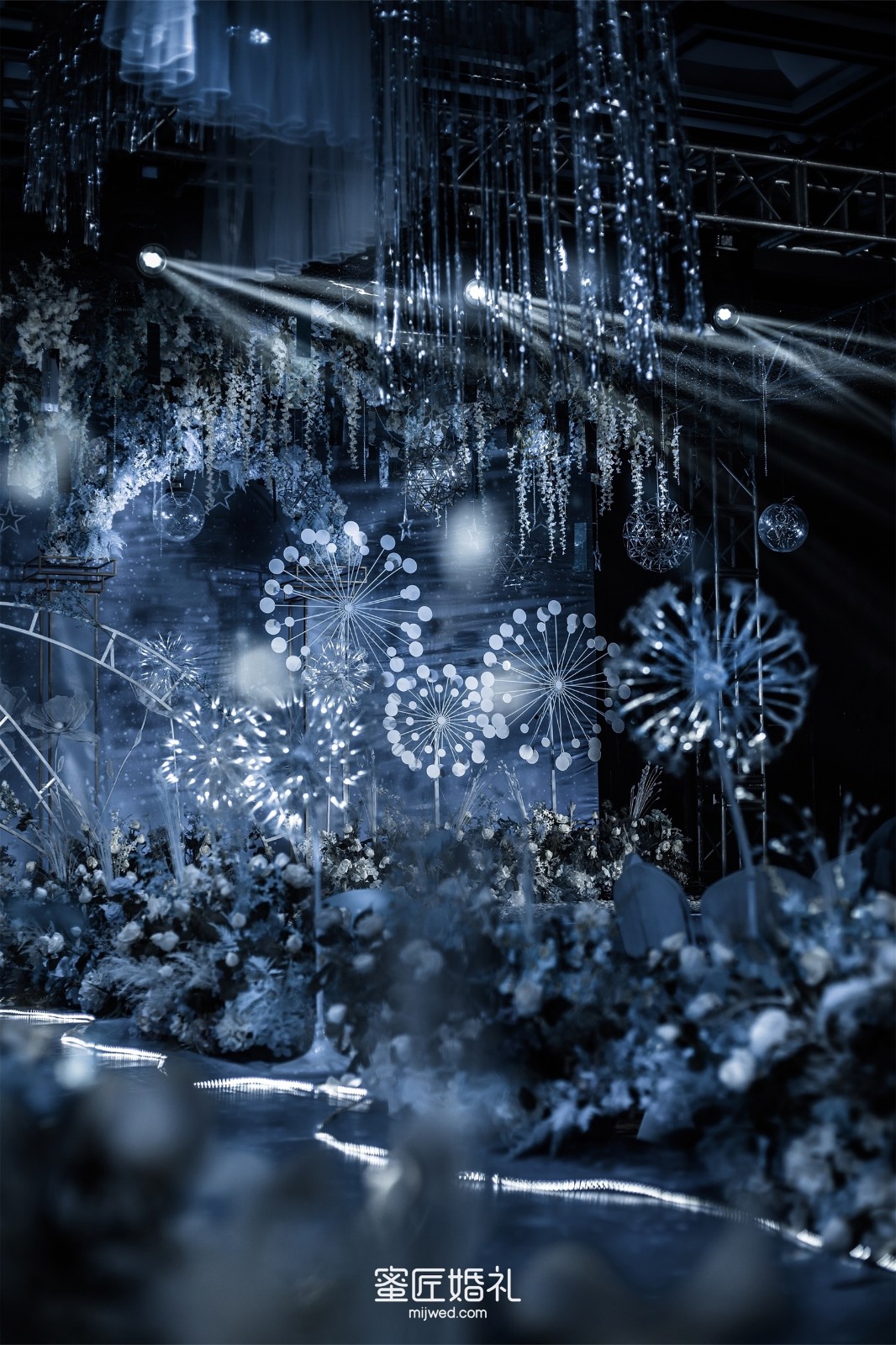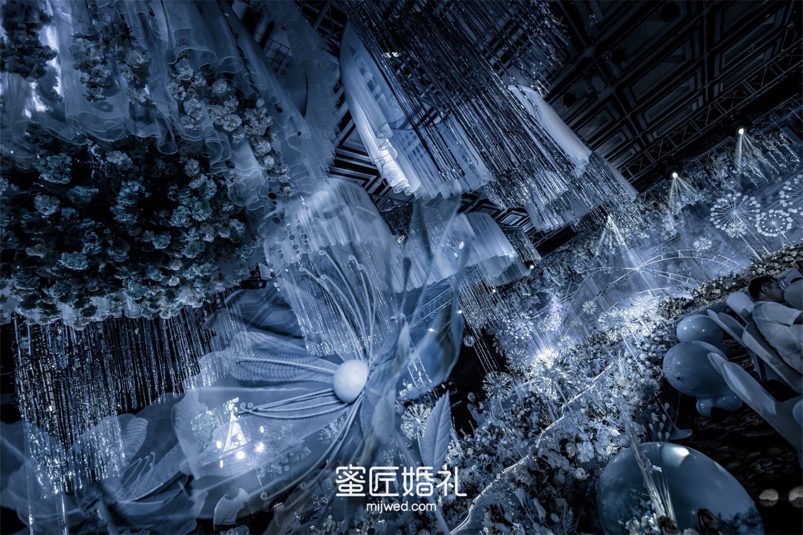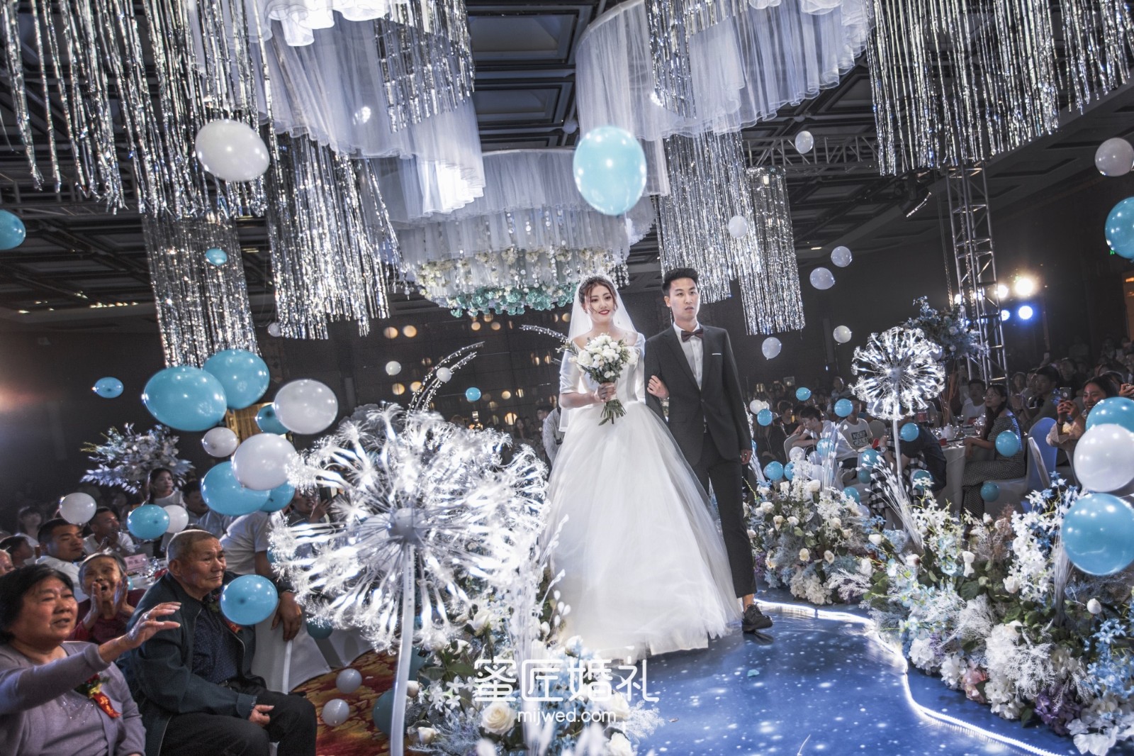 清透浪漫的水蓝色,Ins风蒲公英灯,大气浪漫的花艺顶,还有棉花糖一样的风车在光影中流转,在场宾客仿佛走进蓝色深海一般,我的婚礼现场比设计图还要震撼百倍!